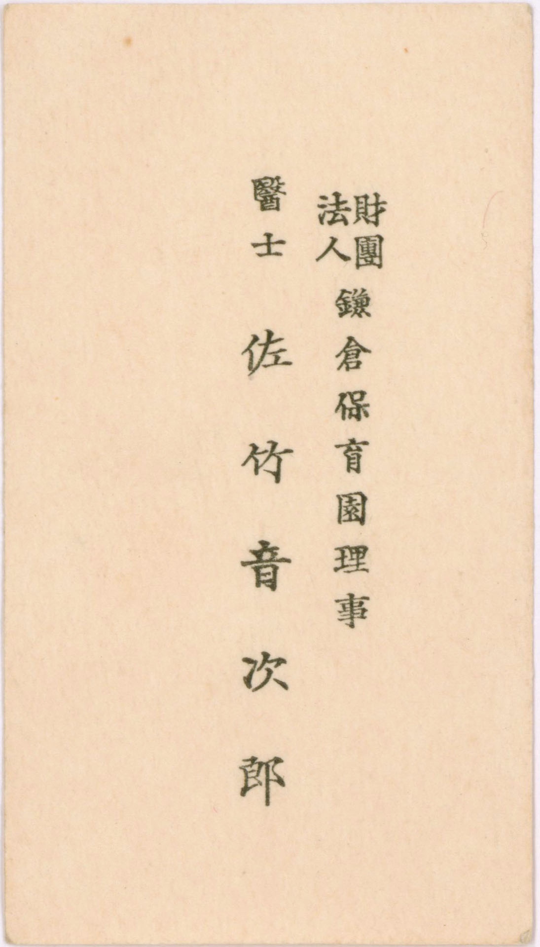 音次郎の名刺は右肩に「財團法人 鎌倉保育園理事」、中央に「醫士 佐竹音次郎」とあり